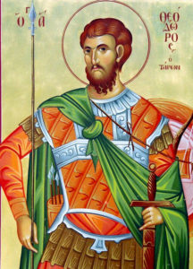 Константинопольскому некий святозарный воин и говорит, чтобы он немедля собрал духовное стадо свое, и дал ему знать об угрожающей опасности, с повелением не покупать в следующие дни ничего, что будет выставлено на торжище. «Чем же пропитаться нам в эти дни, накормить столько людей? — вопросил святитель – ибо у многих ничего нет в доме». «Коливом или вареной пшеницей — ответствовал явившийся». «Кто же ты? – вопросил Патриарх. «Христов мученик Феодор» — ответил явившийся.