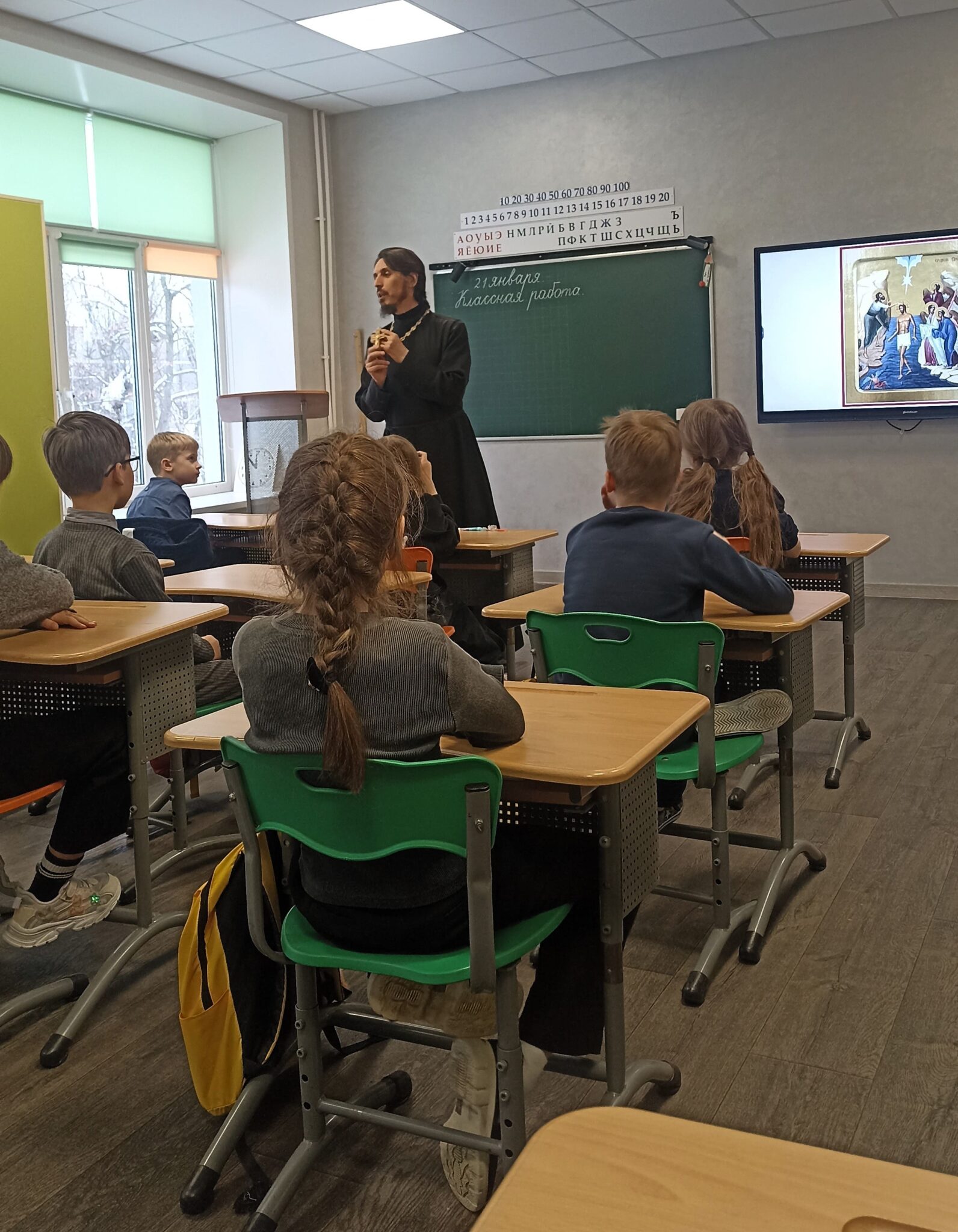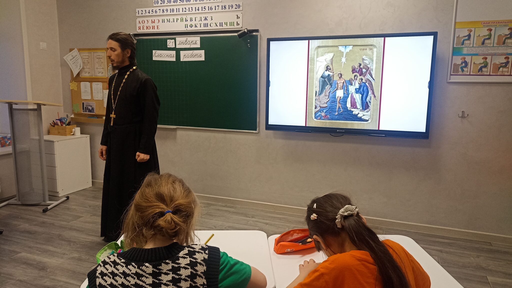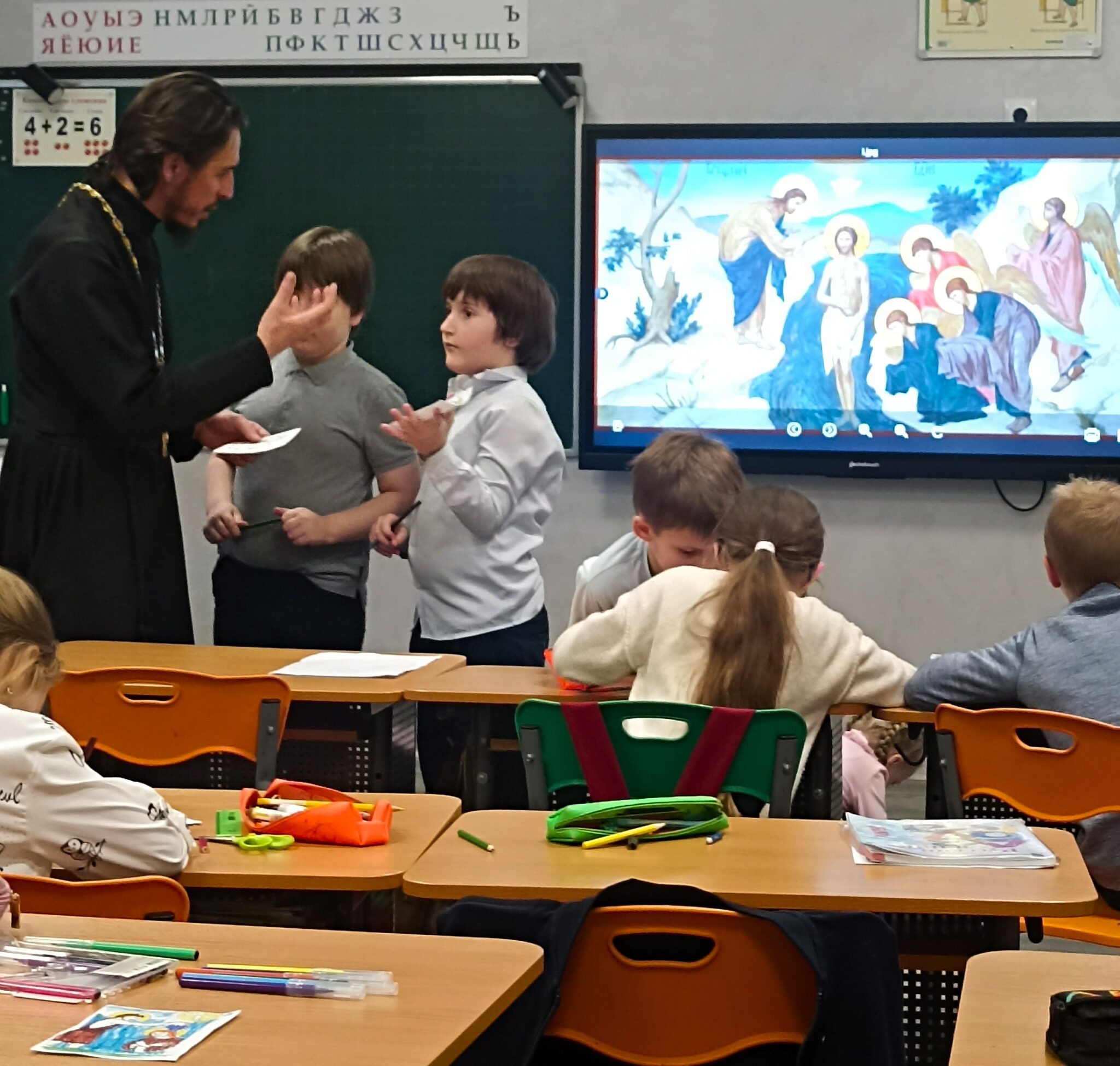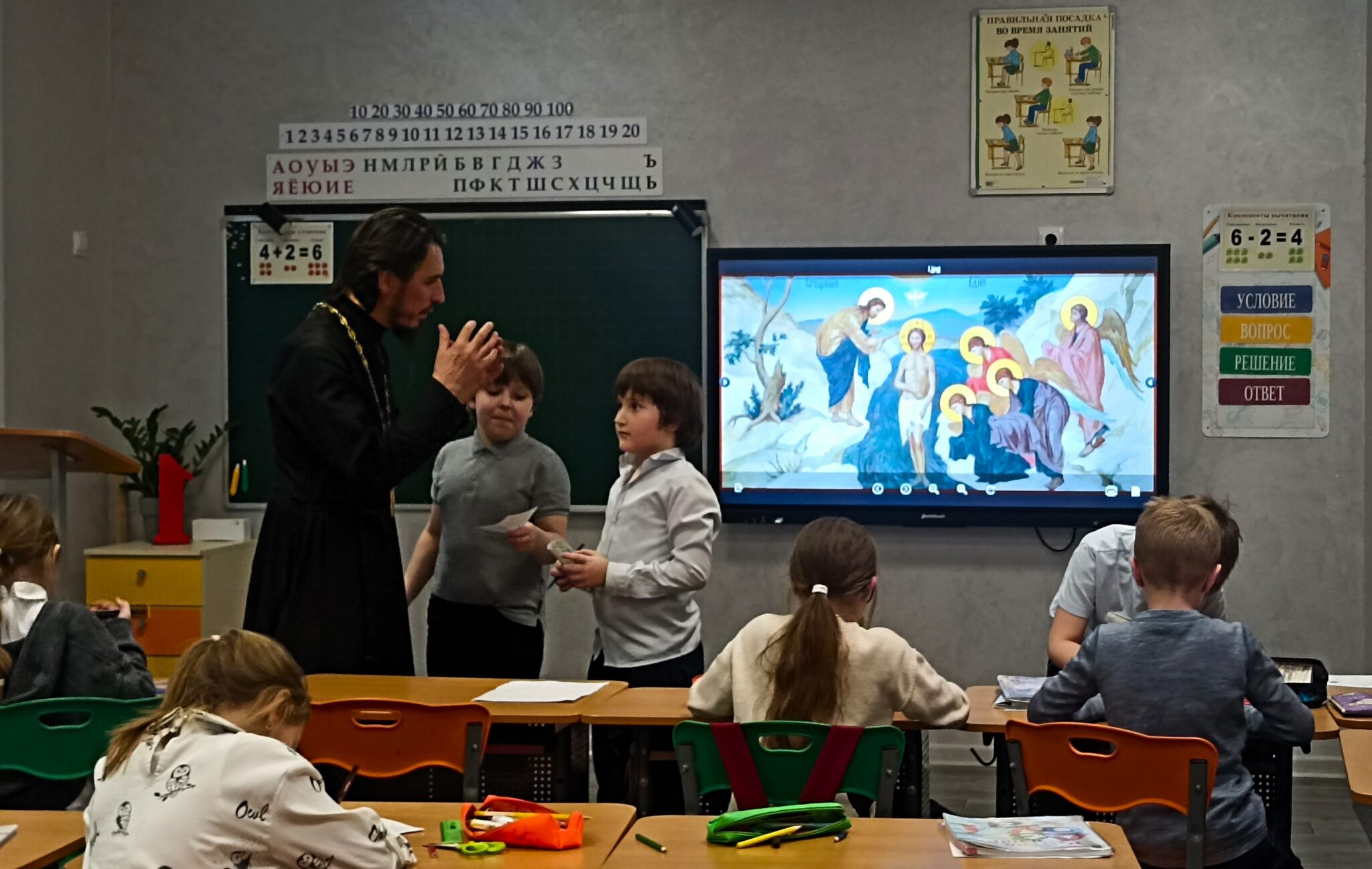 Отец Андрей по ежегодной традиции посетил Новую школу Натальи Колгановой, чтобы рассказать учащимся о Великом празднике Богоявления.