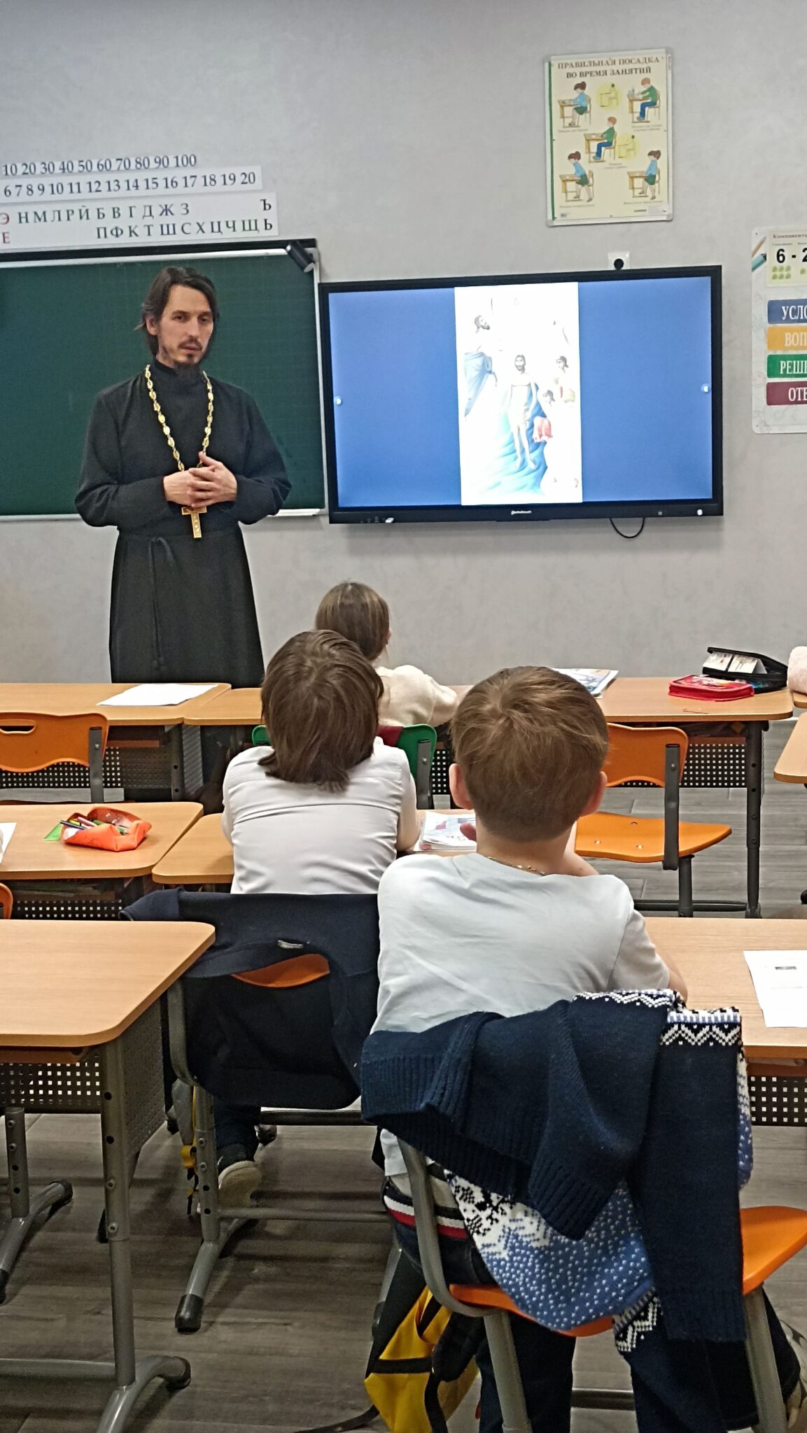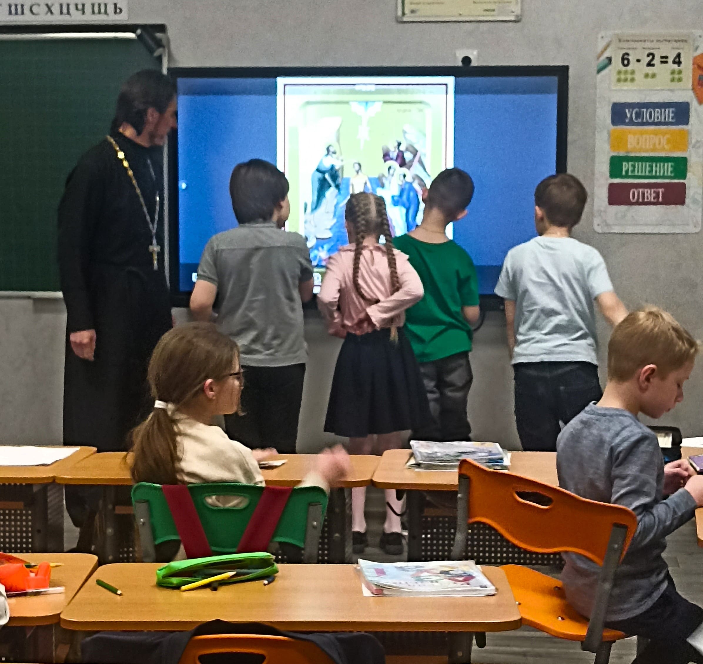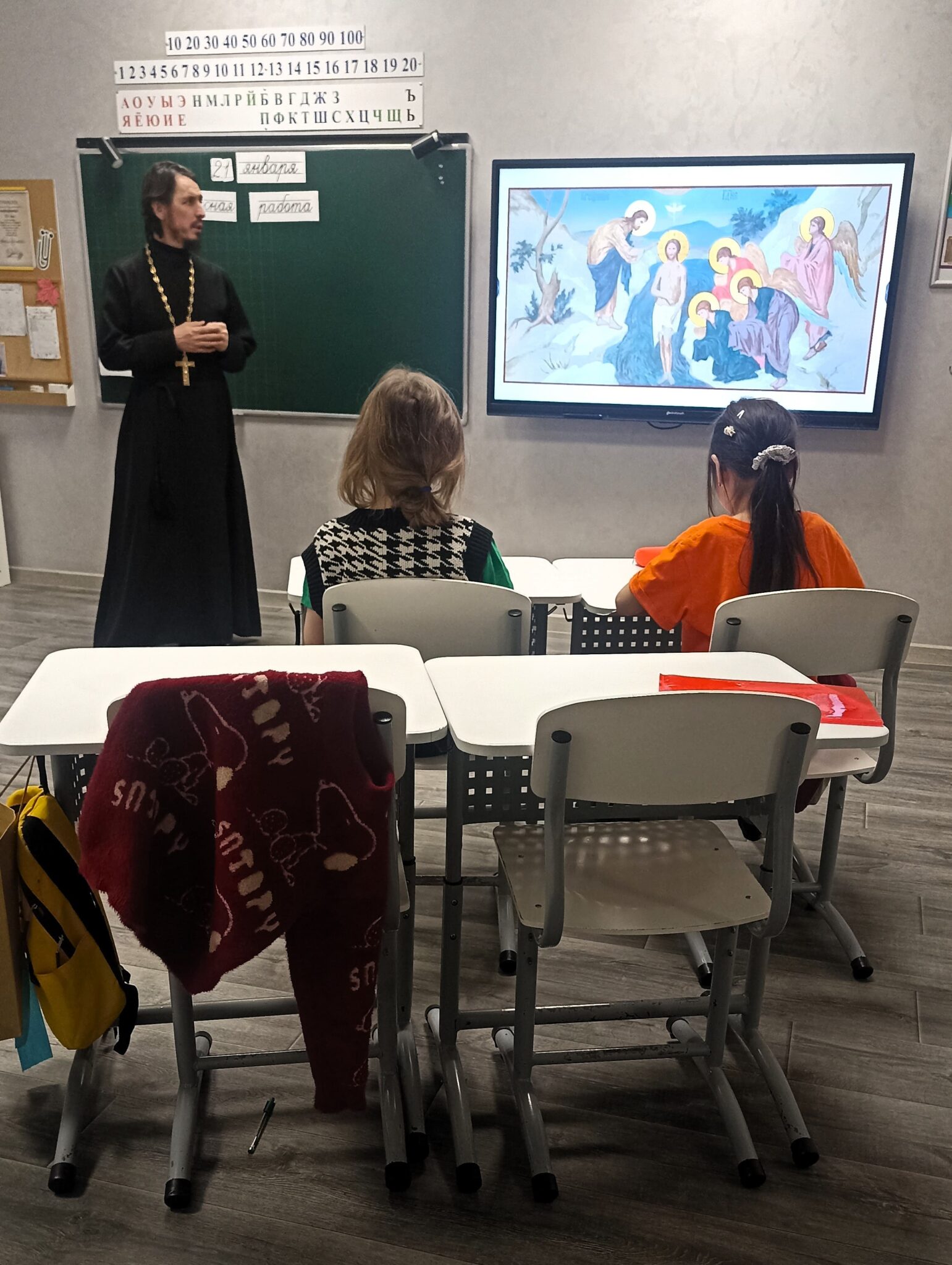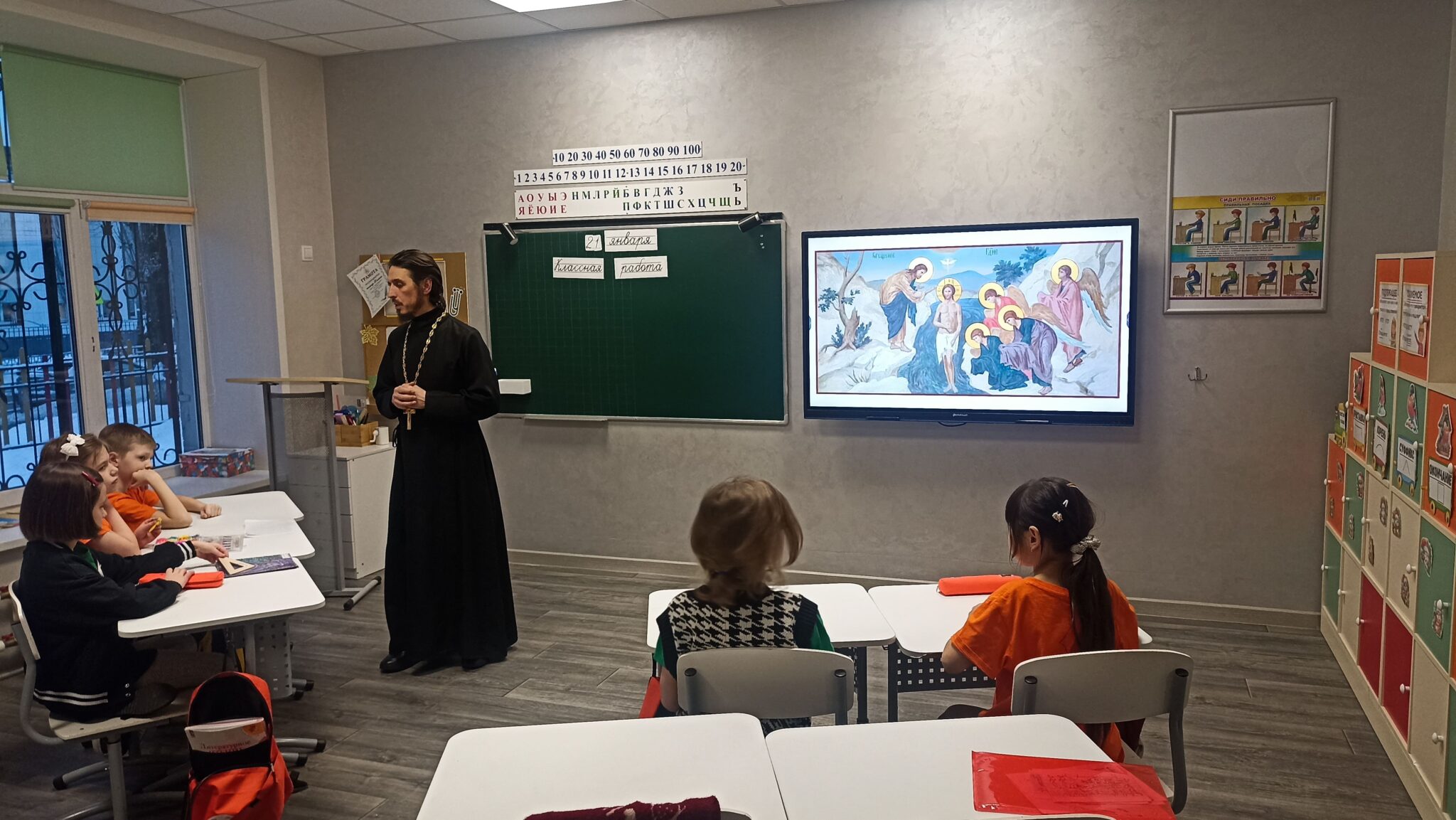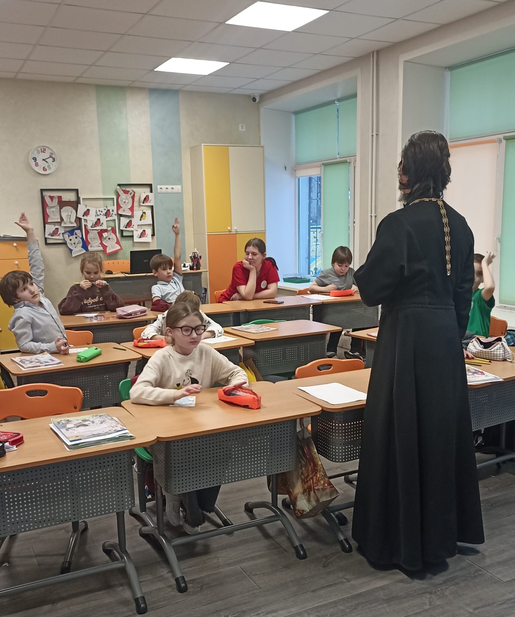 Отец Андрей по ежегодной традиции посетил Новую школу Натальи Колгановой, чтобы рассказать учащимся о Великом празднике Богоявления.