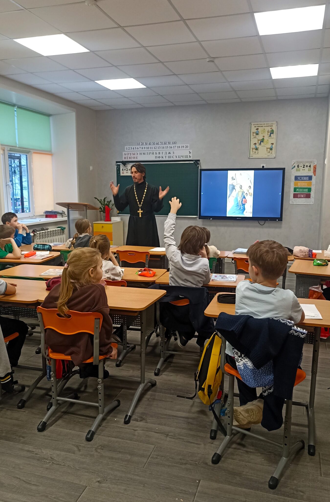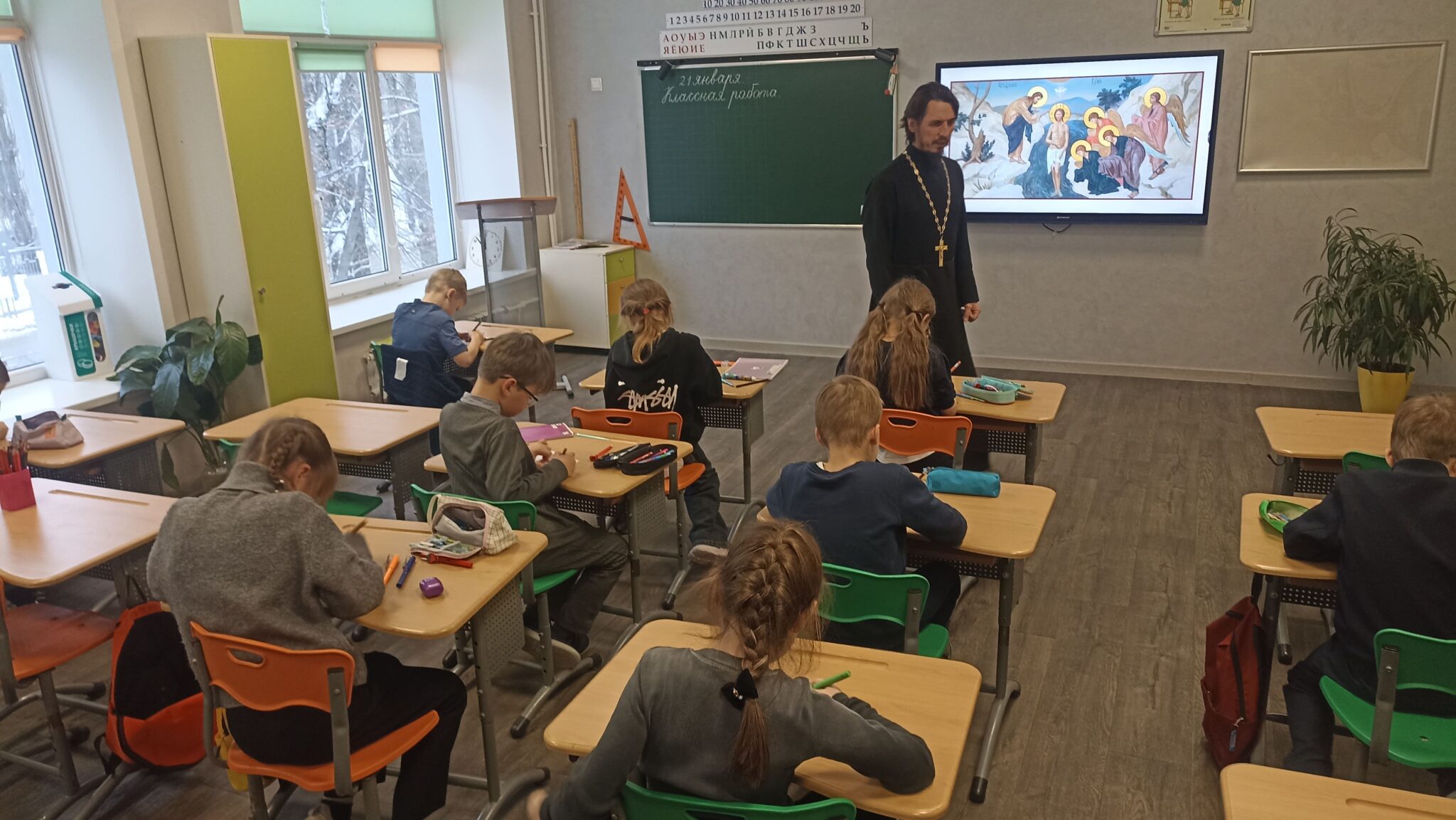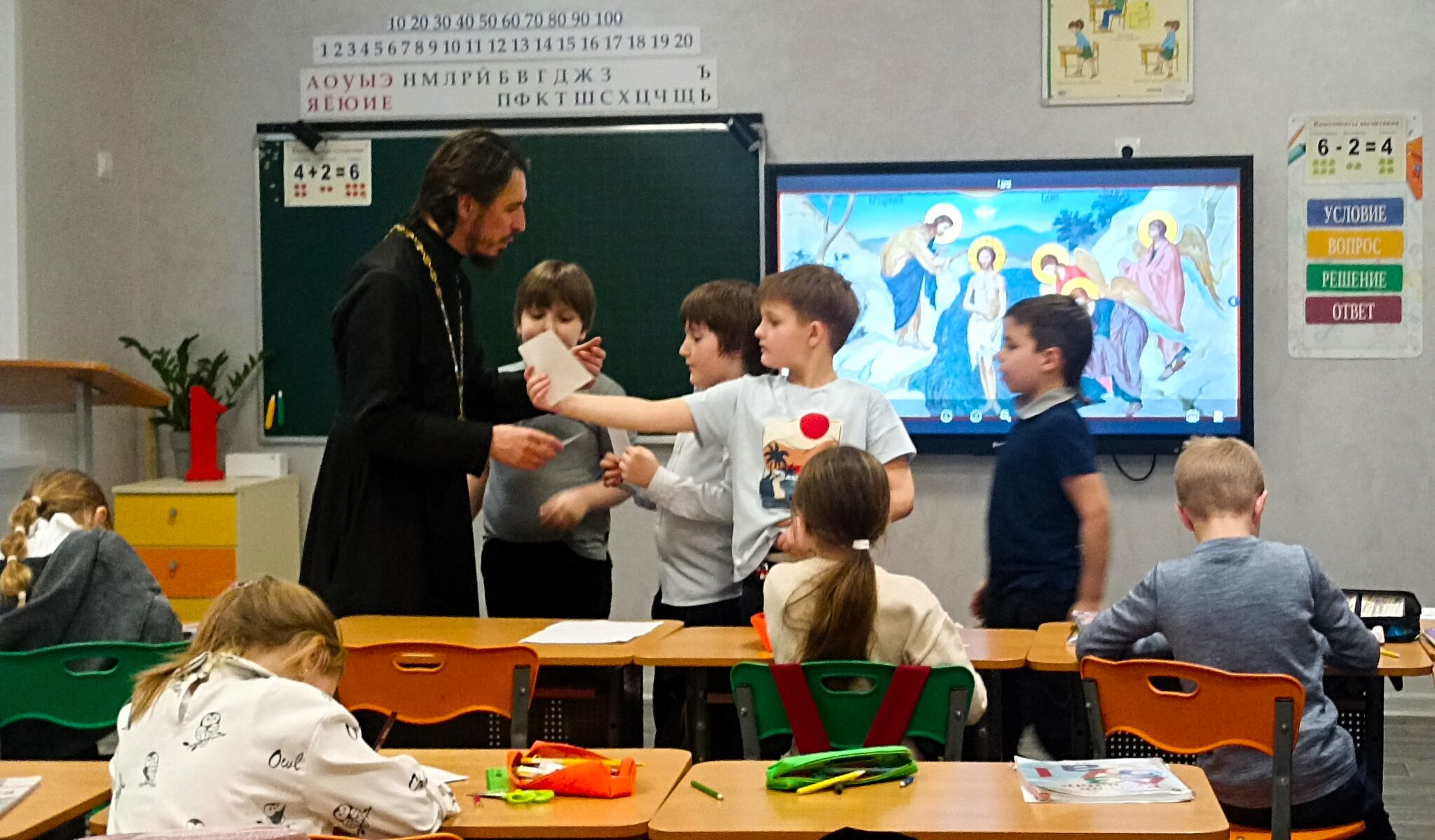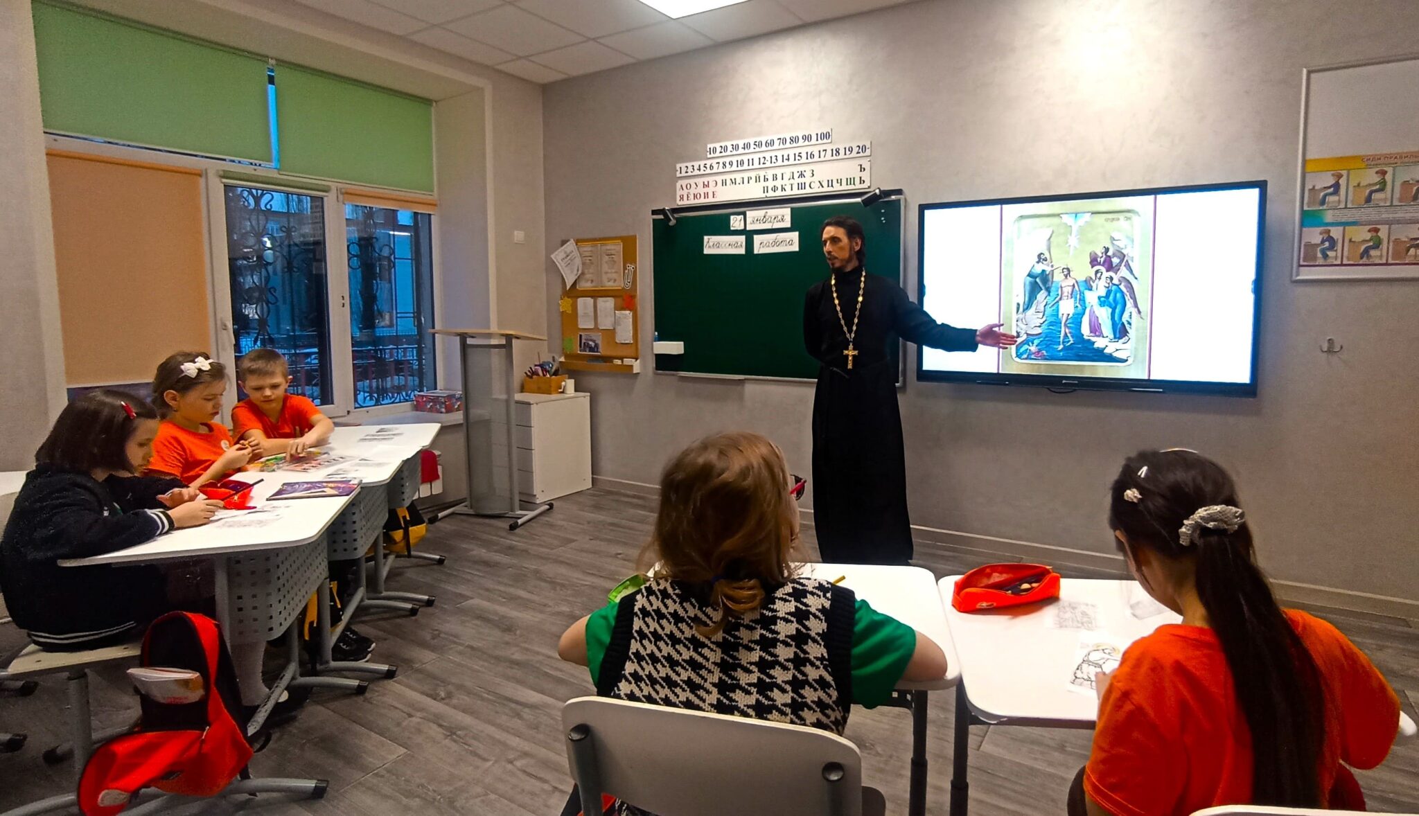 Отец Андрей по ежегодной традиции посетил Новую школу Натальи Колгановой, чтобы рассказать учащимся о Великом празднике Богоявления.