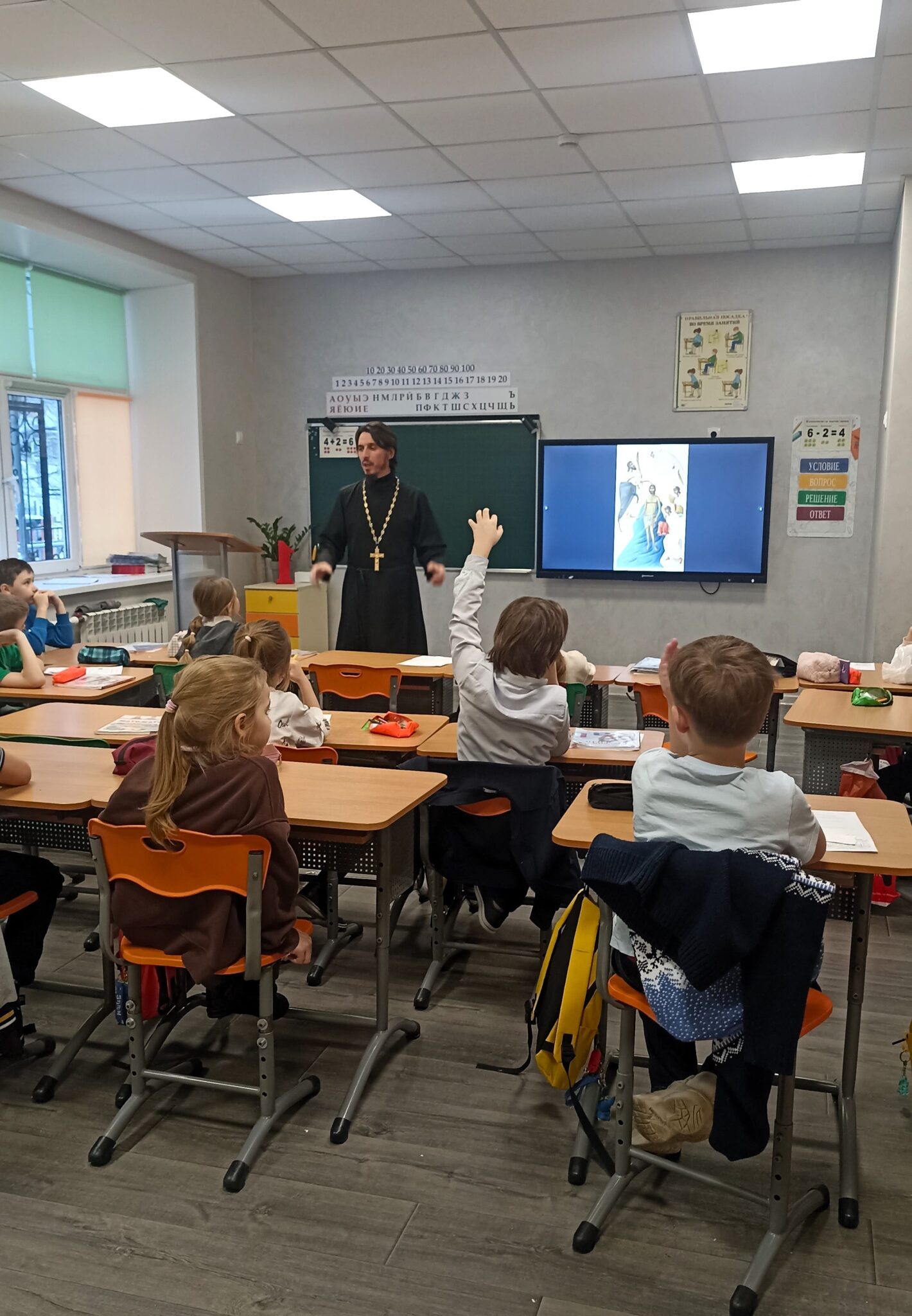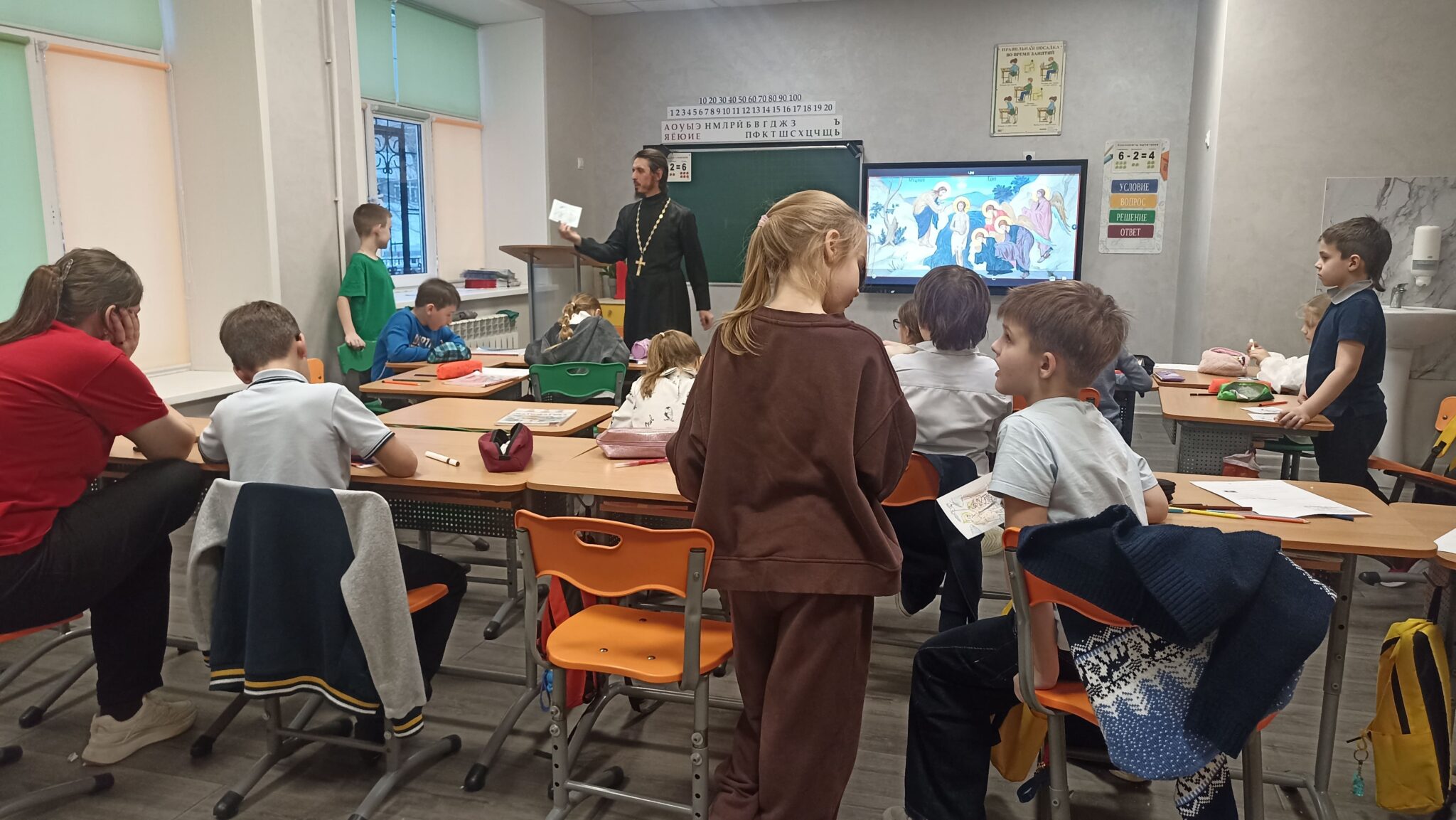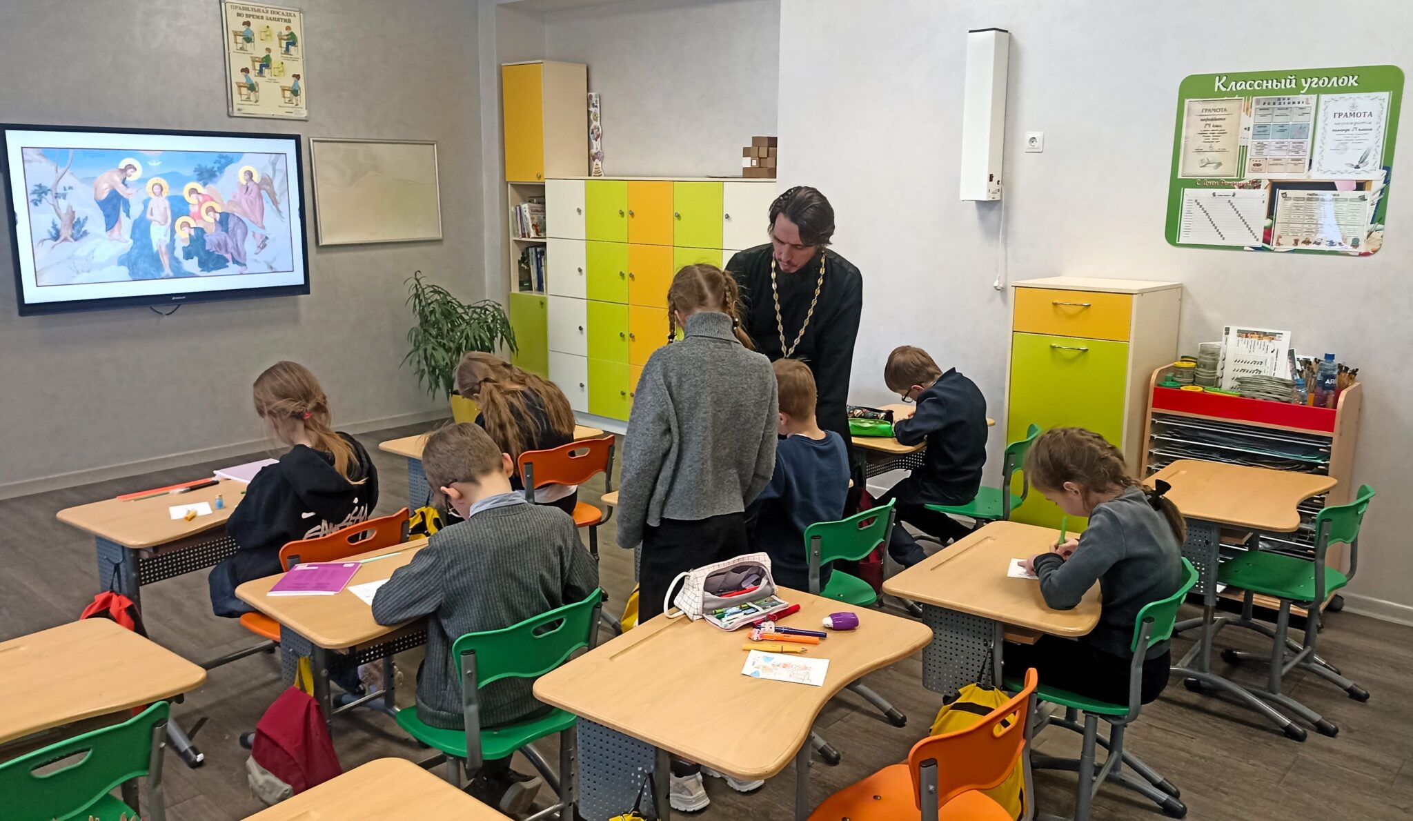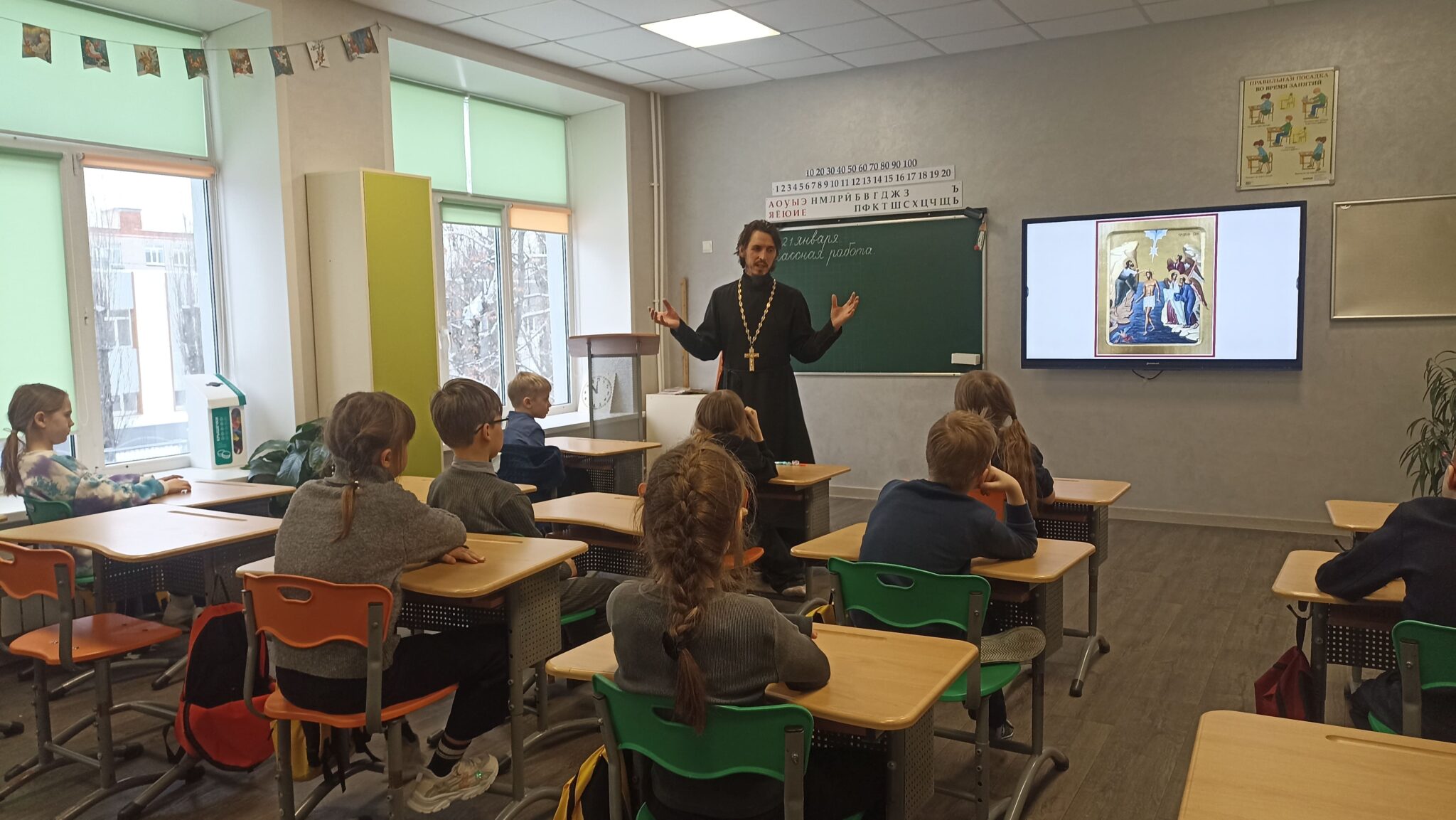Отец Андрей по ежегодной традиции посетил Новую школу Натальи Колгановой, чтобы рассказать учащимся о Великом празднике Богоявления.