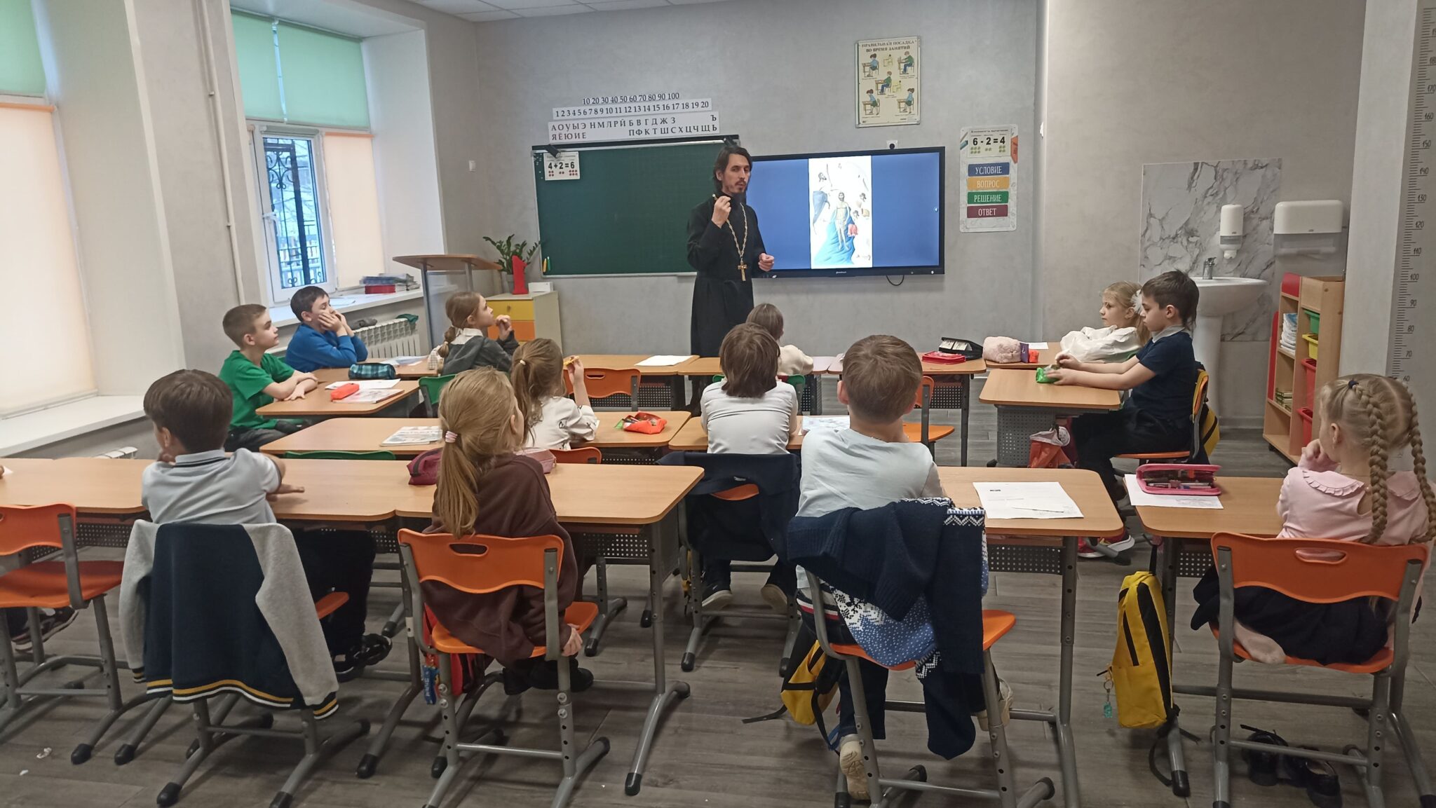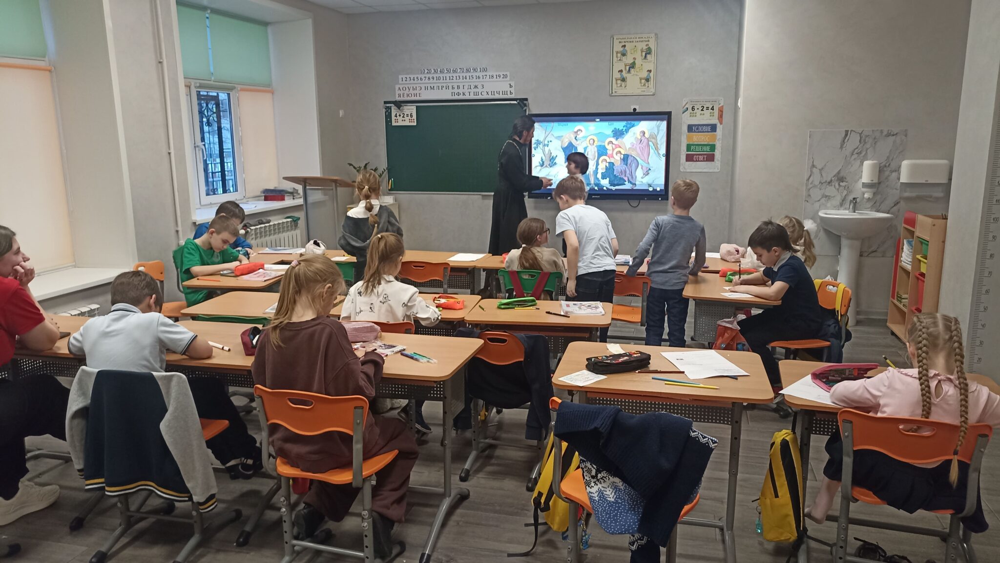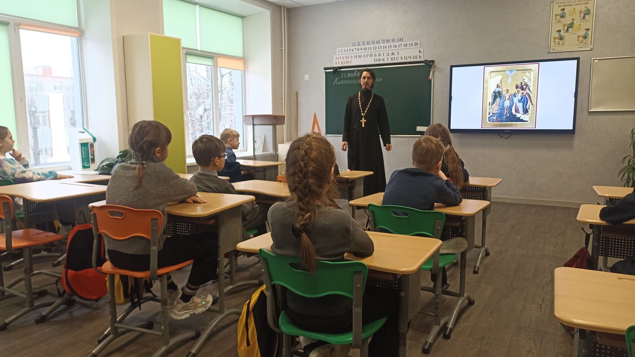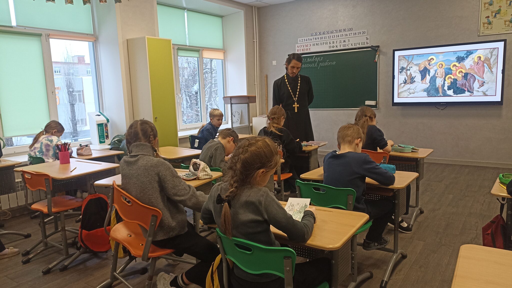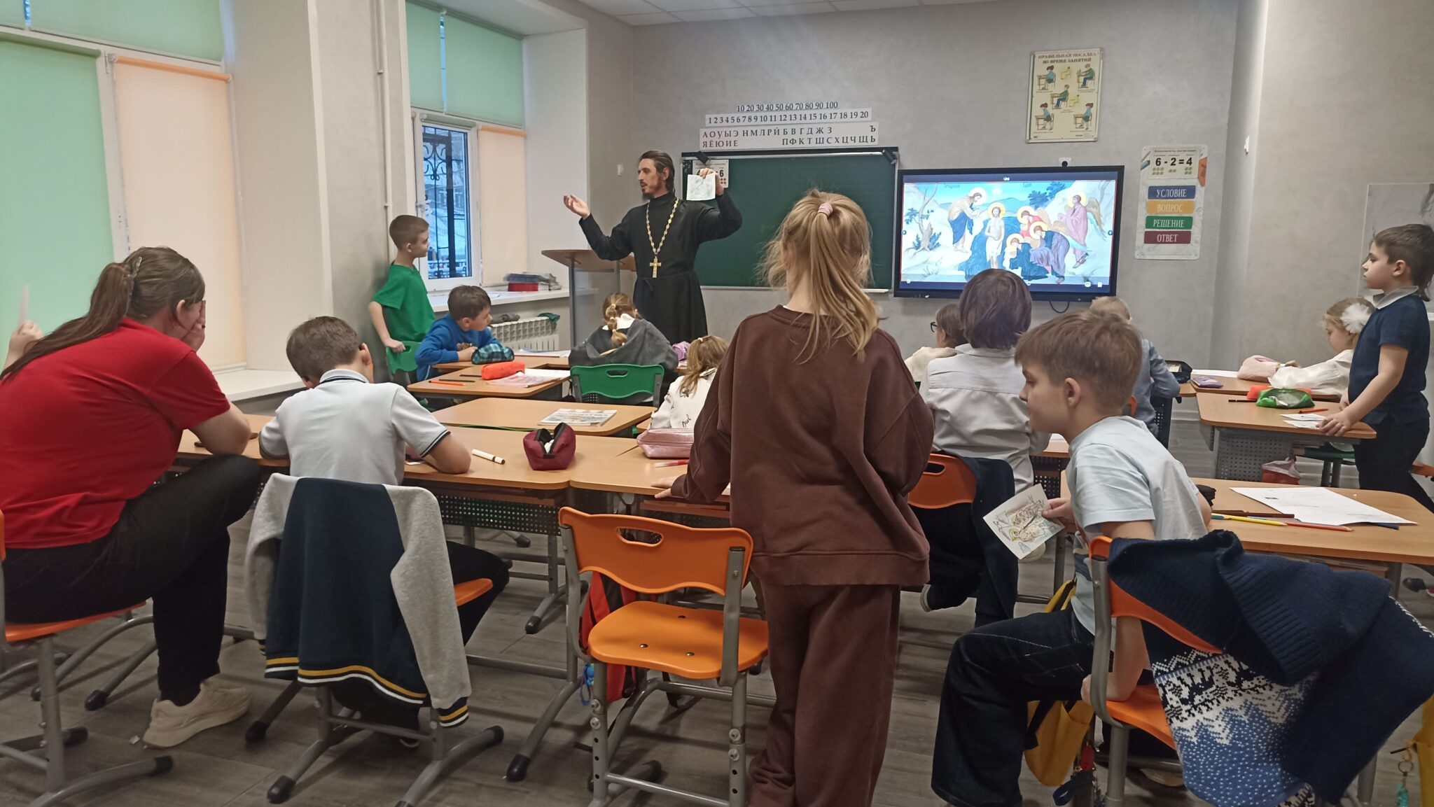 Отец Андрей по ежегодной традиции посетил Новую школу Натальи Колгановой, чтобы рассказать учащимся о Великом празднике Богоявления.