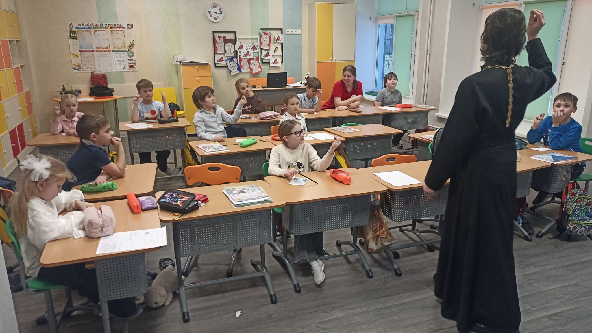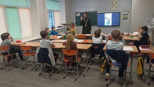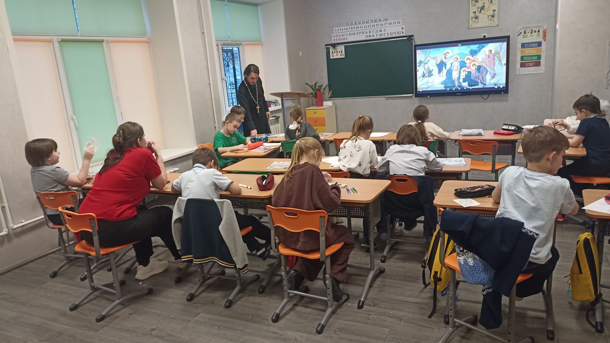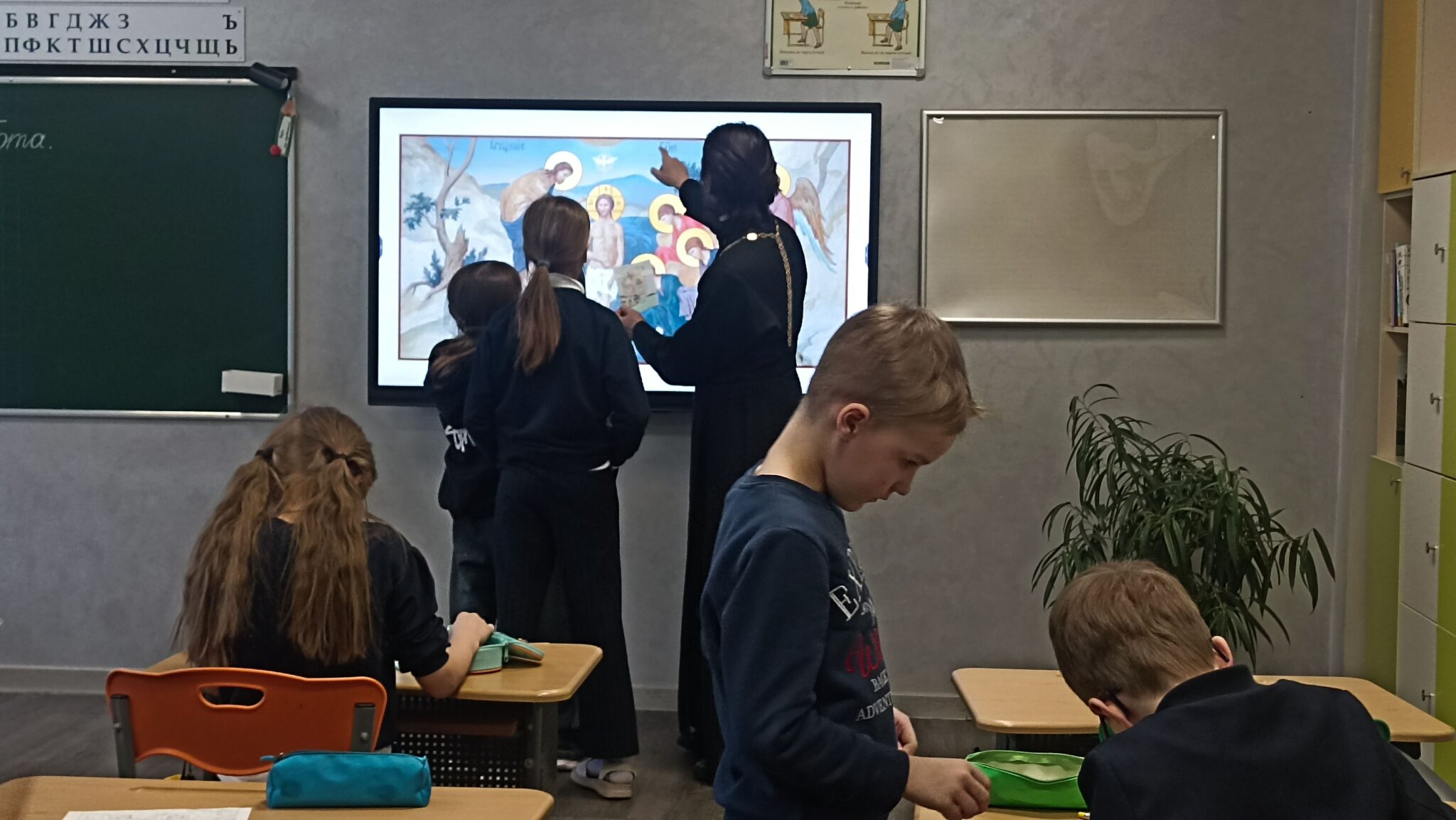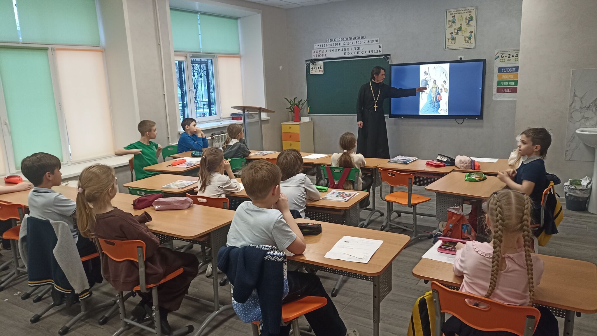 Отец Андрей по ежегодной традиции посетил Новую школу Натальи Колгановой, чтобы рассказать учащимся о Великом празднике Богоявления.