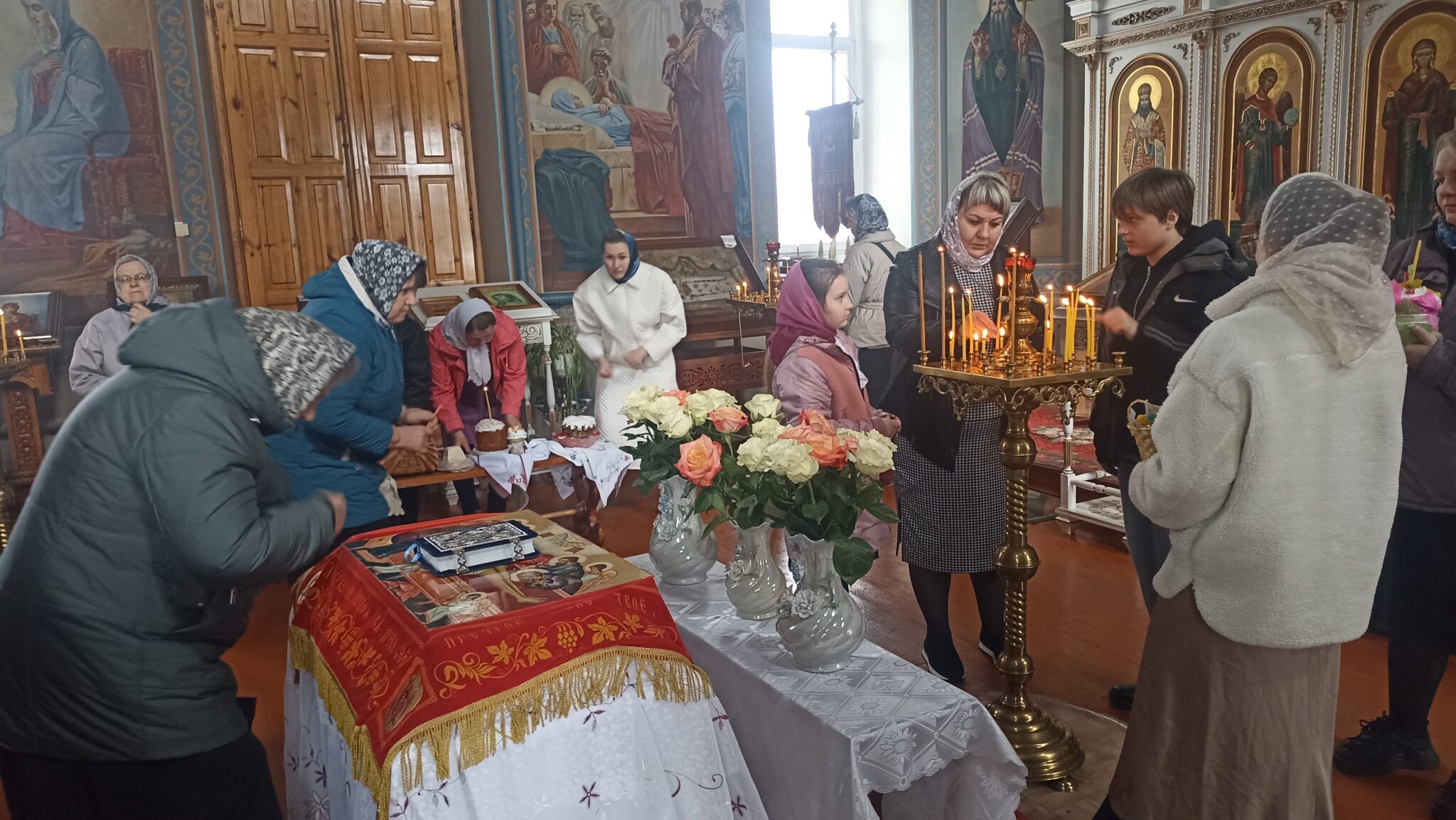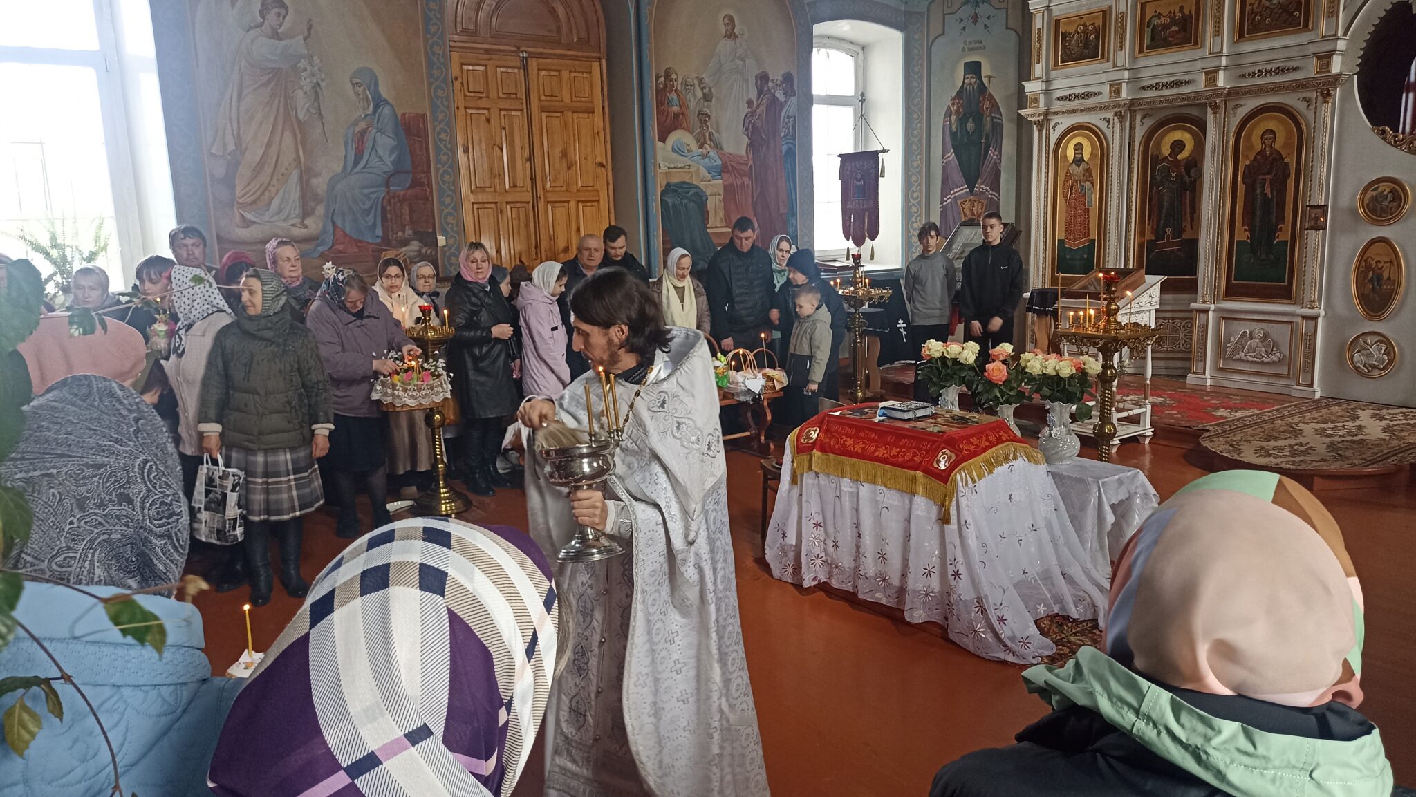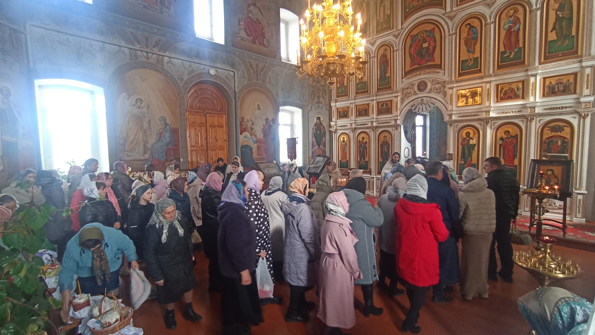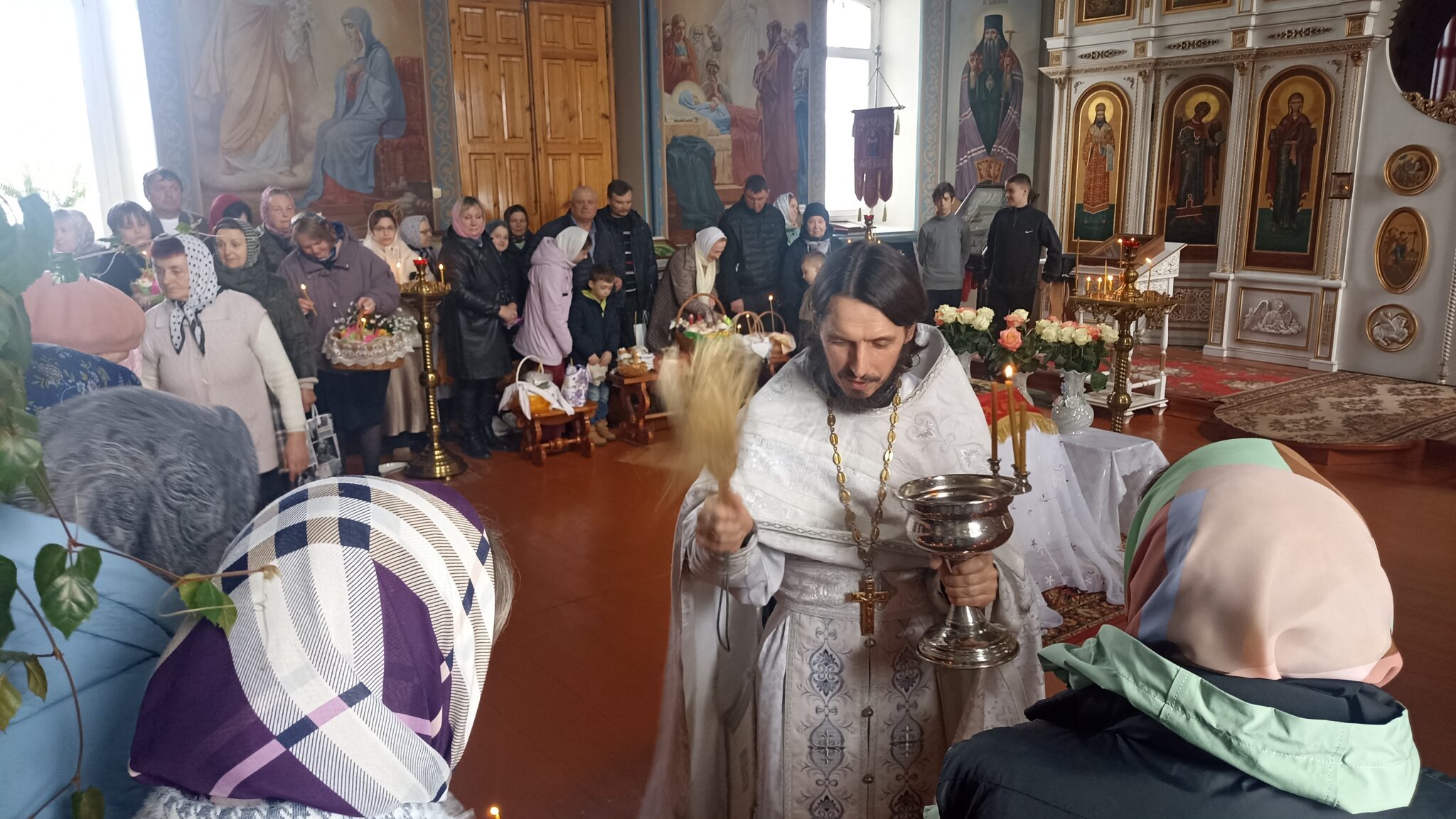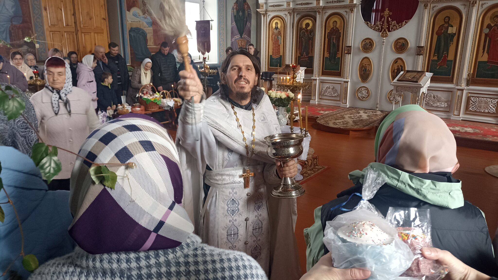 По окончании Божественной литургии настоятель отец Андрей совершил традиционное освящение пасхальной трапезы. Ряды румяных куличей и ярких яиц под сводами храма напомнили нам: пост позади, а впереди — ослепительный свет Пасхи, который уже совсем скоро озарит мир, как Благодатный огонь в Иерусалиме.