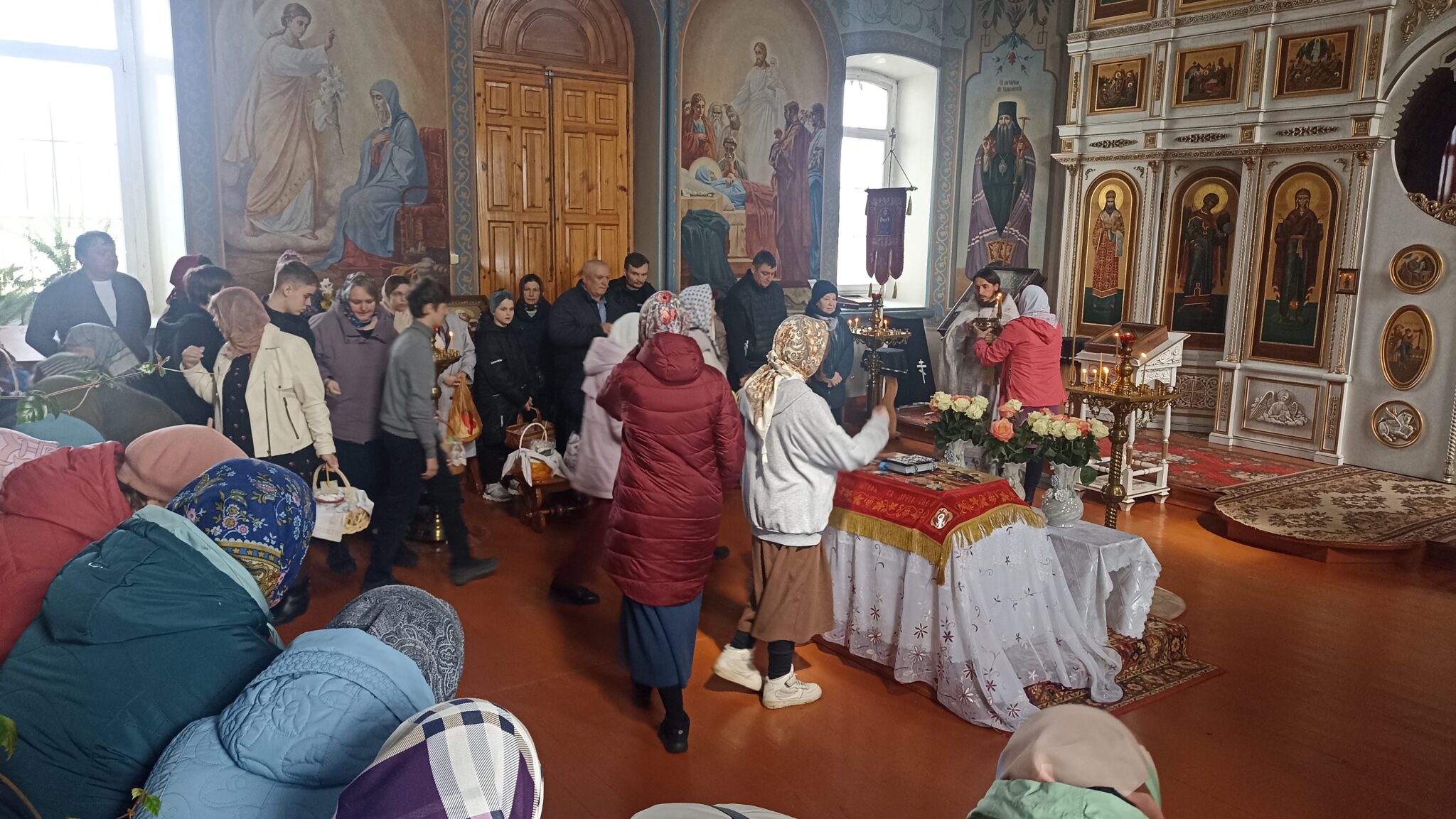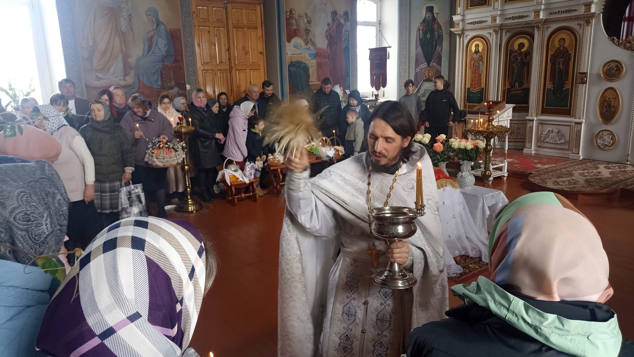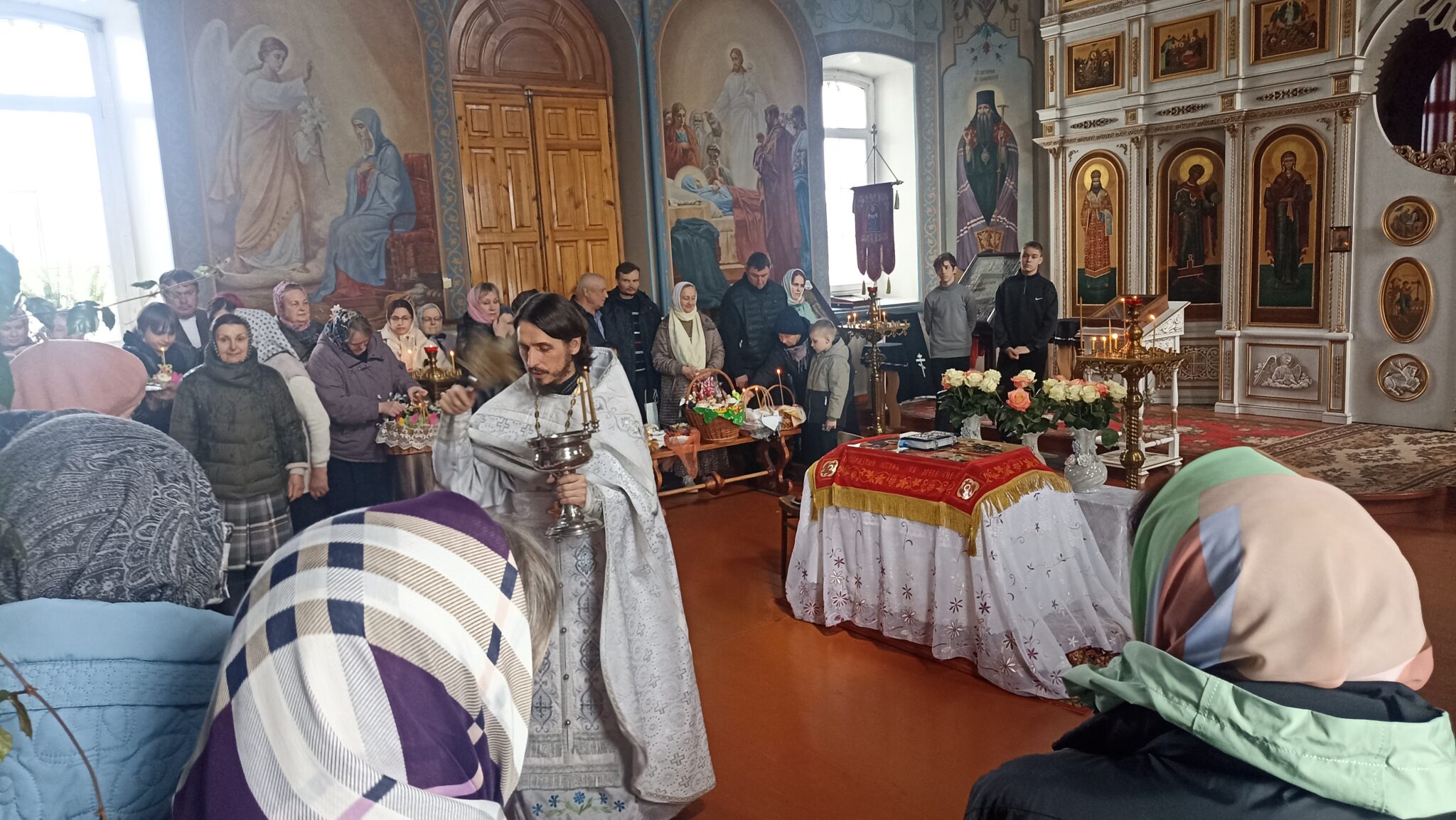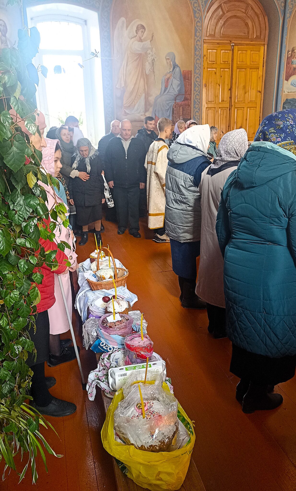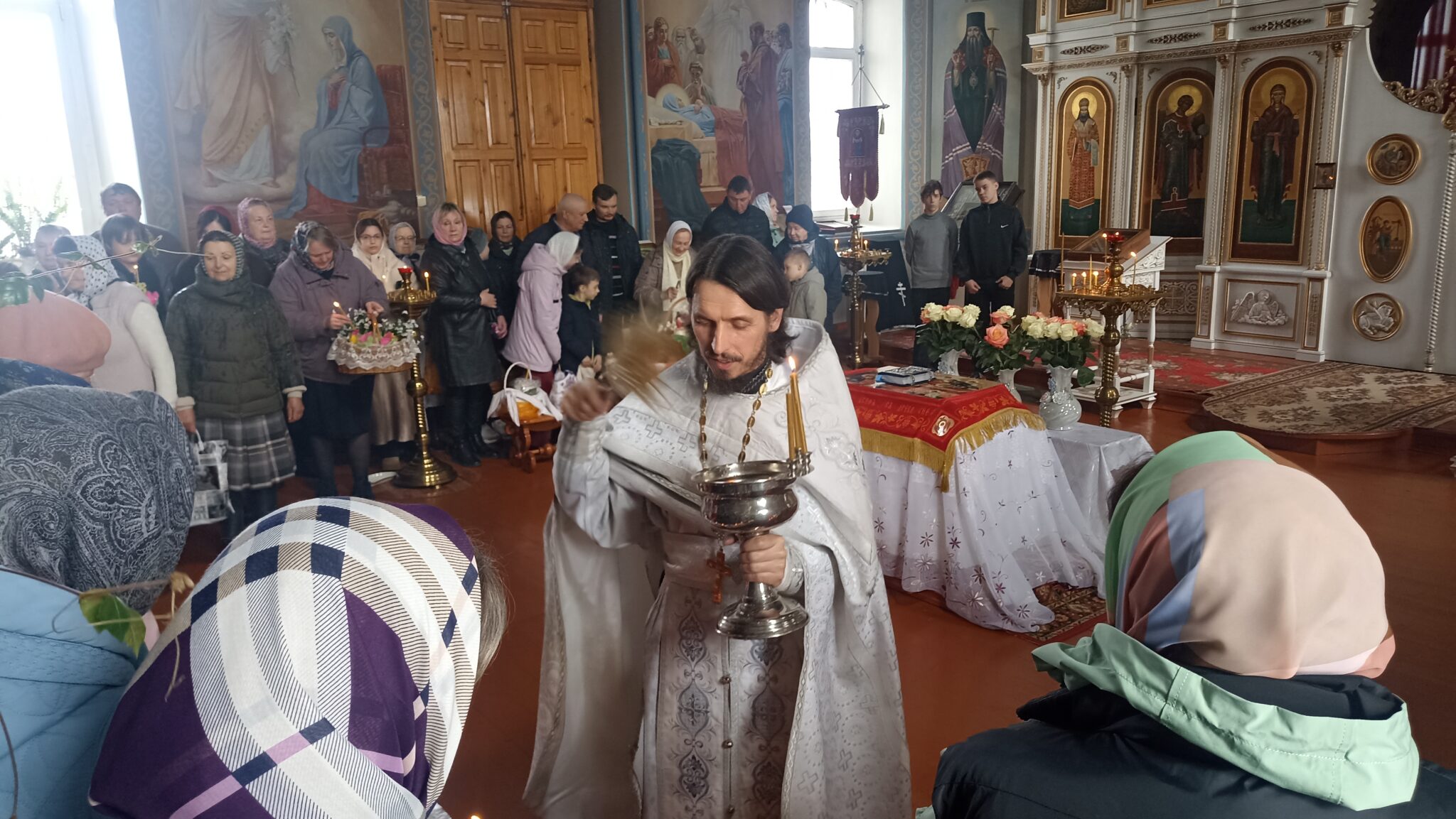 По окончании Божественной литургии настоятель отец Андрей совершил традиционное освящение пасхальной трапезы. Ряды румяных куличей и ярких яиц под сводами храма напомнили нам: пост позади, а впереди — ослепительный свет Пасхи, который уже совсем скоро озарит мир, как Благодатный огонь в Иерусалиме.