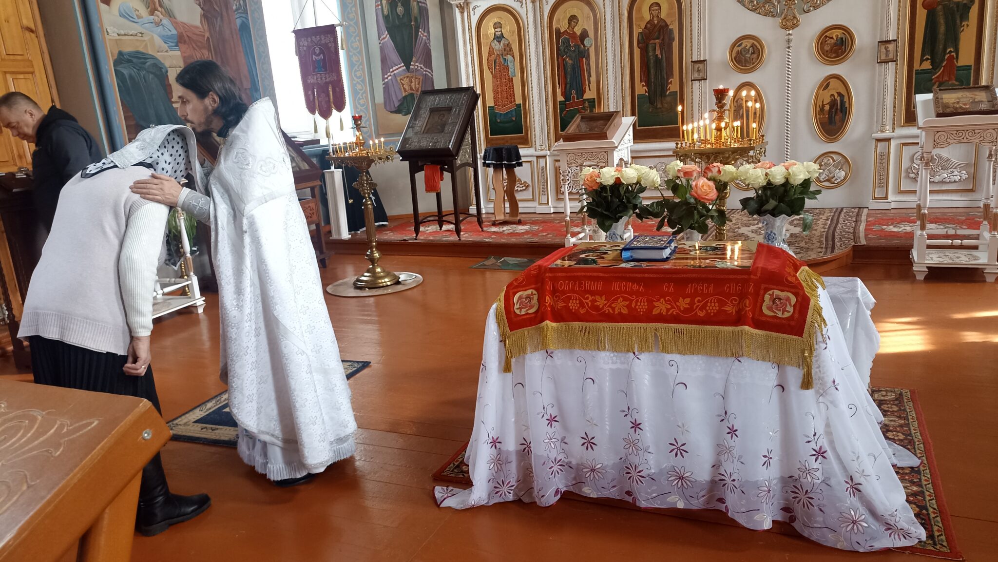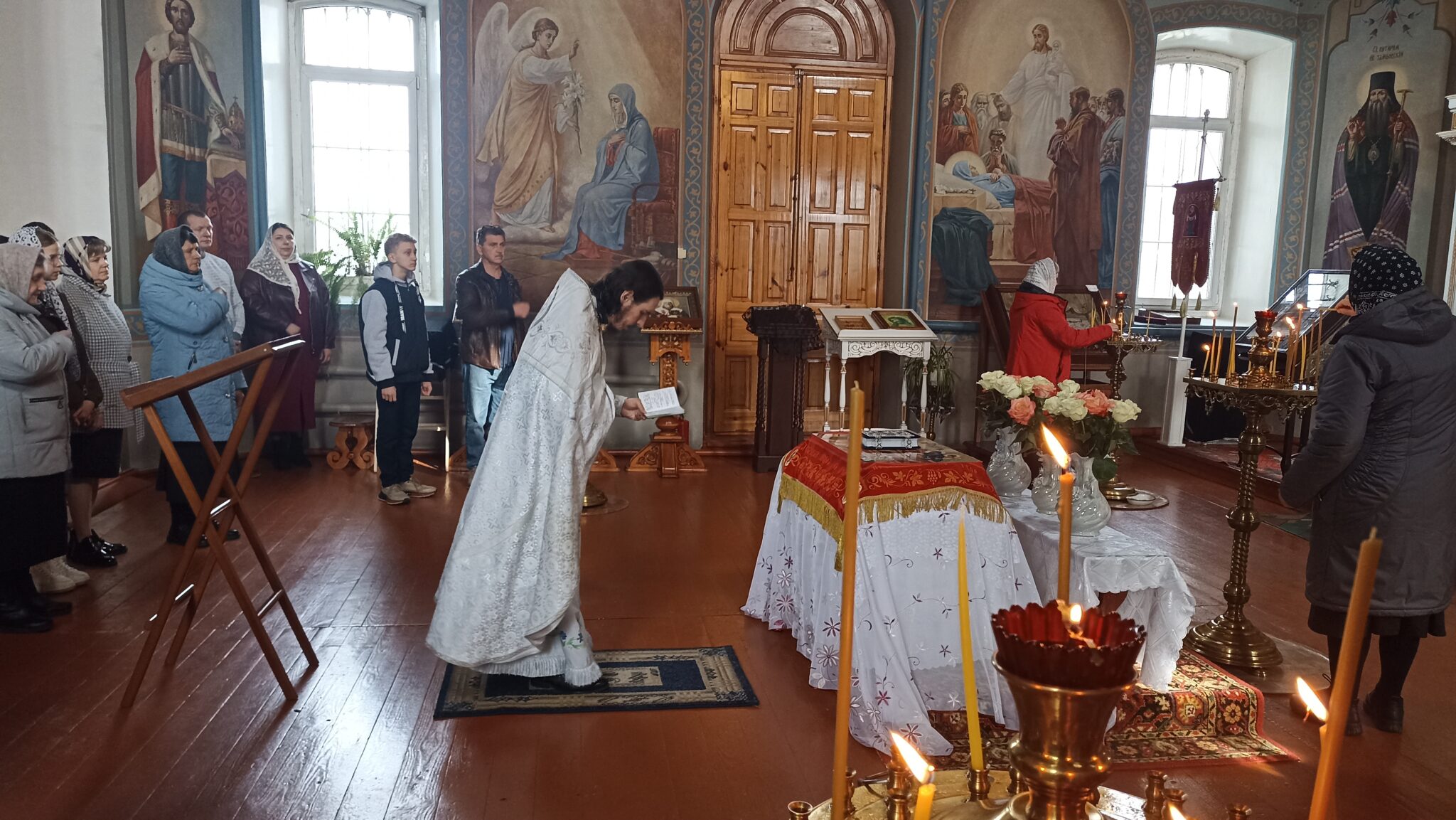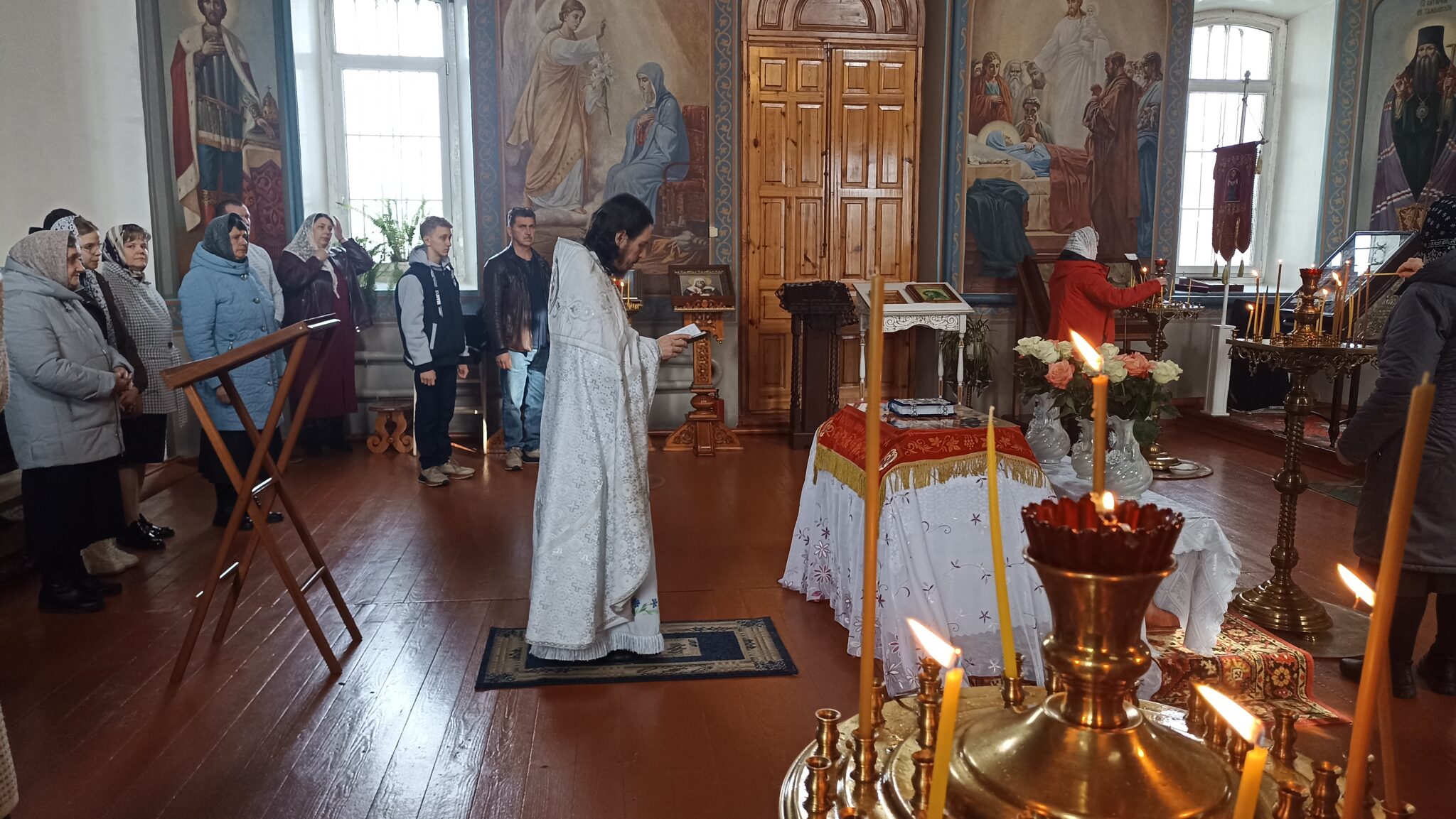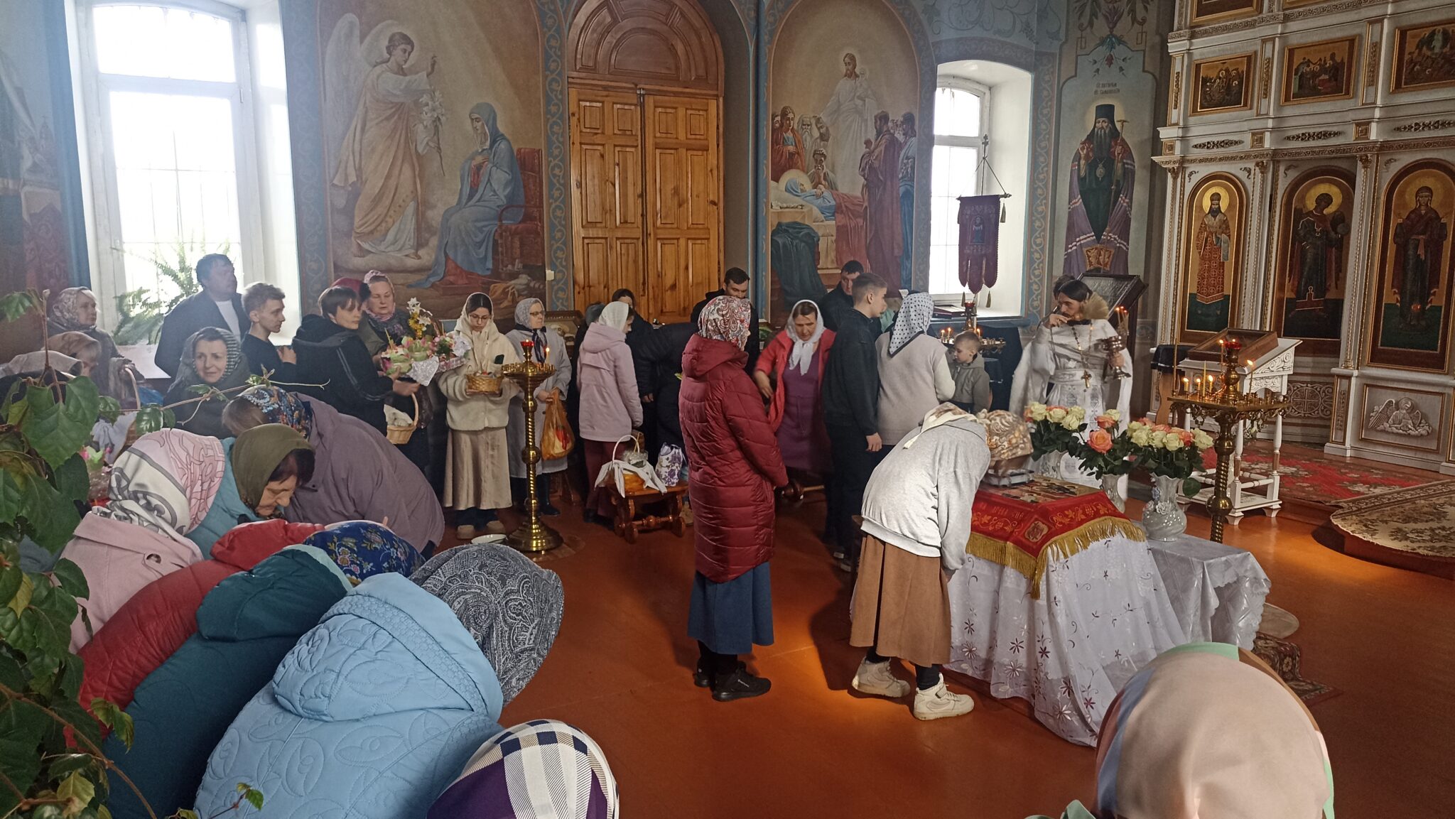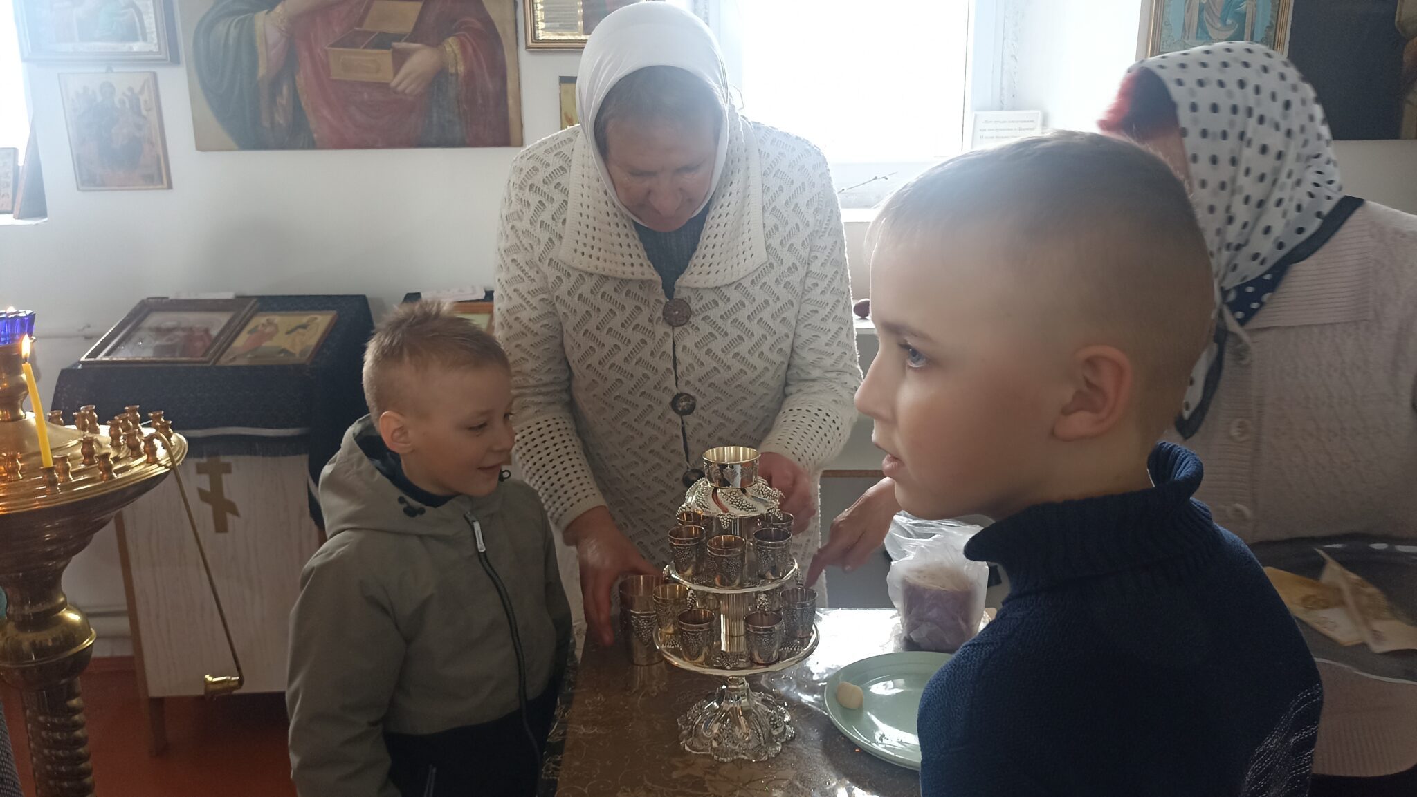 По окончании Божественной литургии настоятель отец Андрей совершил традиционное освящение пасхальной трапезы. Ряды румяных куличей и ярких яиц под сводами храма напомнили нам: пост позади, а впереди — ослепительный свет Пасхи, который уже совсем скоро озарит мир, как Благодатный огонь в Иерусалиме.